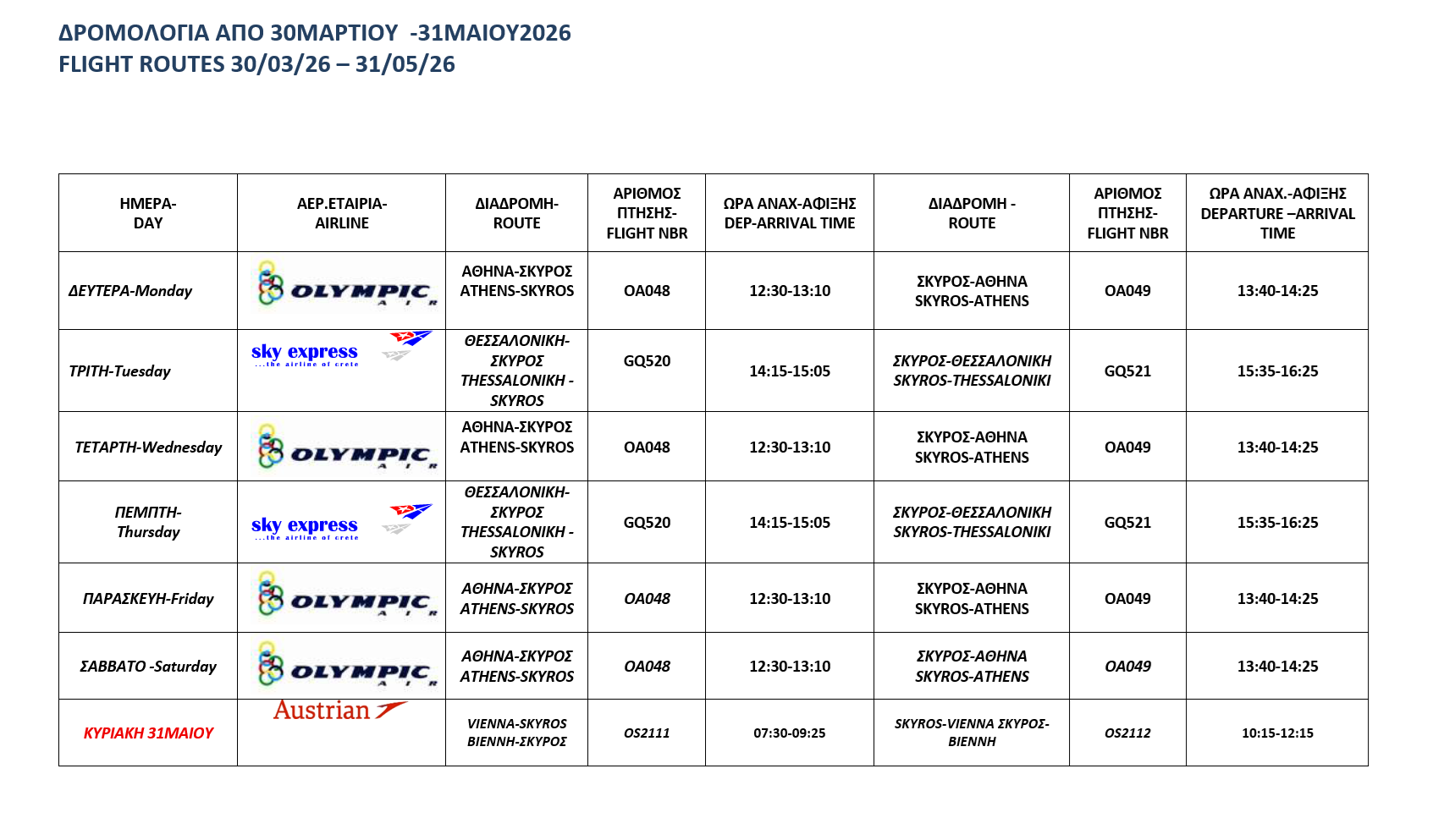 Αρ. Πτήσης: ΟΑ048 Αθήνα (13:20) – Σκύρος (14:15)